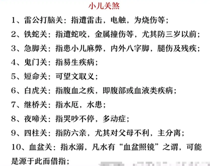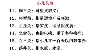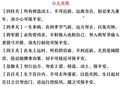 小儿关煞有很多种,每种都有具体的表现。比如“夜哭关”的孩子夜间经常啼哭,睡眠不安。“水火关”提醒家长注意孩子玩水、玩火时的安全。“阎王关”和“短命关”指的是在某个年龄段孩子身体可能比较弱,需要格外小心照顾。“将军关”提醒注意手脚不要被尖锐物品所伤。“深水关”强调防溺水。“雷公打脑关”指需注意突然的惊吓或头部保护。“鸡飞关”和“落井关”则是提醒注意日常环境中的意外风险。这些关煞都与孩子的出生时辰有关。