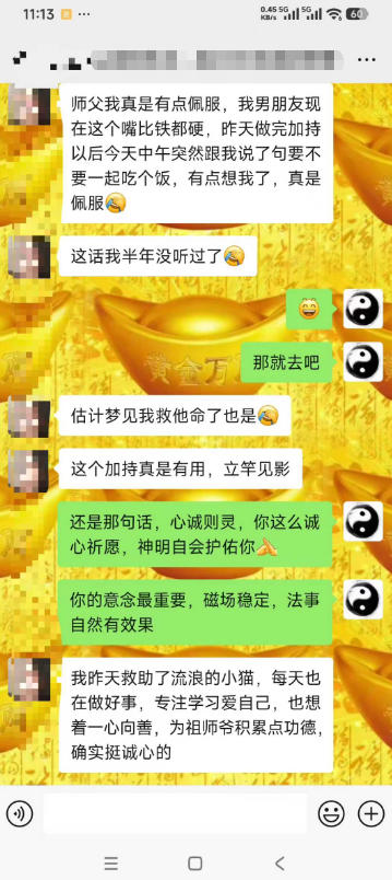 加持法事善信反馈,收到好的反馈也很开心,和合催动两人的感情。既然想挽回感情,也要有一个乐观向上的心态,如果你每天就想着抱怨,负能量,那么,能成的事也不会成的,这就是磁场,起心动念接是因,当下所受接是果。福生无量天尊!